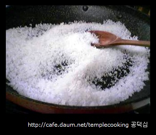 녹은 소금이 다시 마를 때까지 계속 후라이팬에서 졸여서 소금을 만든다