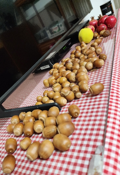 야산 벤치에 앉아 쉴 때 툭 떨어지는 반들반들한 도토리 2~3개 주워 온 것들입니다.